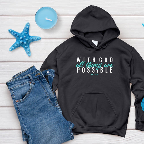 With God all things are possible - Christian Hoodie (Charcoal-Teal)