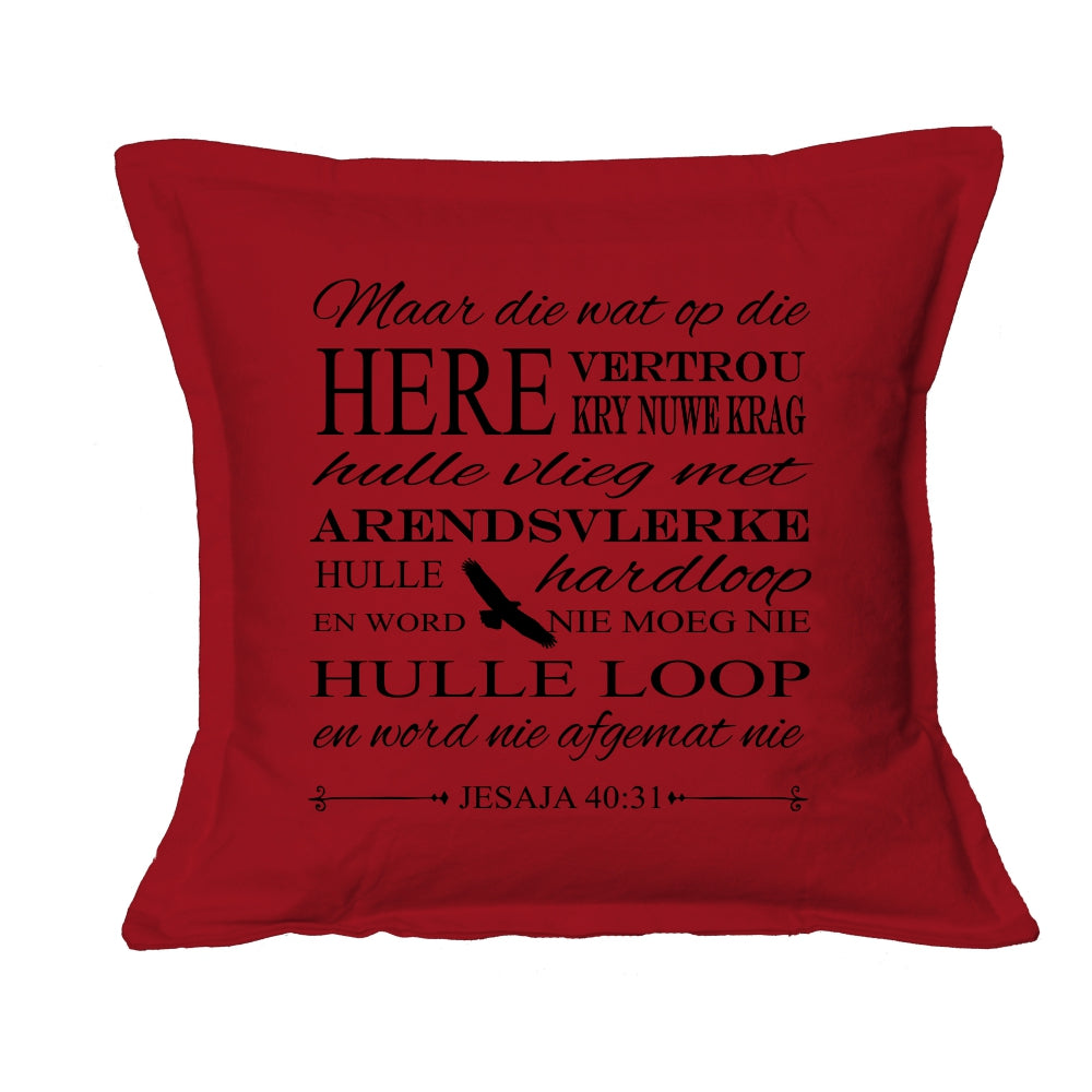 Bring Scripture to your home with this Christian scatter cushion cover, featuring Isaiah 40:31 – “Arendsvlerke” in Afrikaans. Screenprinted on a cotton twill/polyester blend and sized for 45cm x 45cm cushions, it keeps God’s Word clearly present in everyday spaces.
