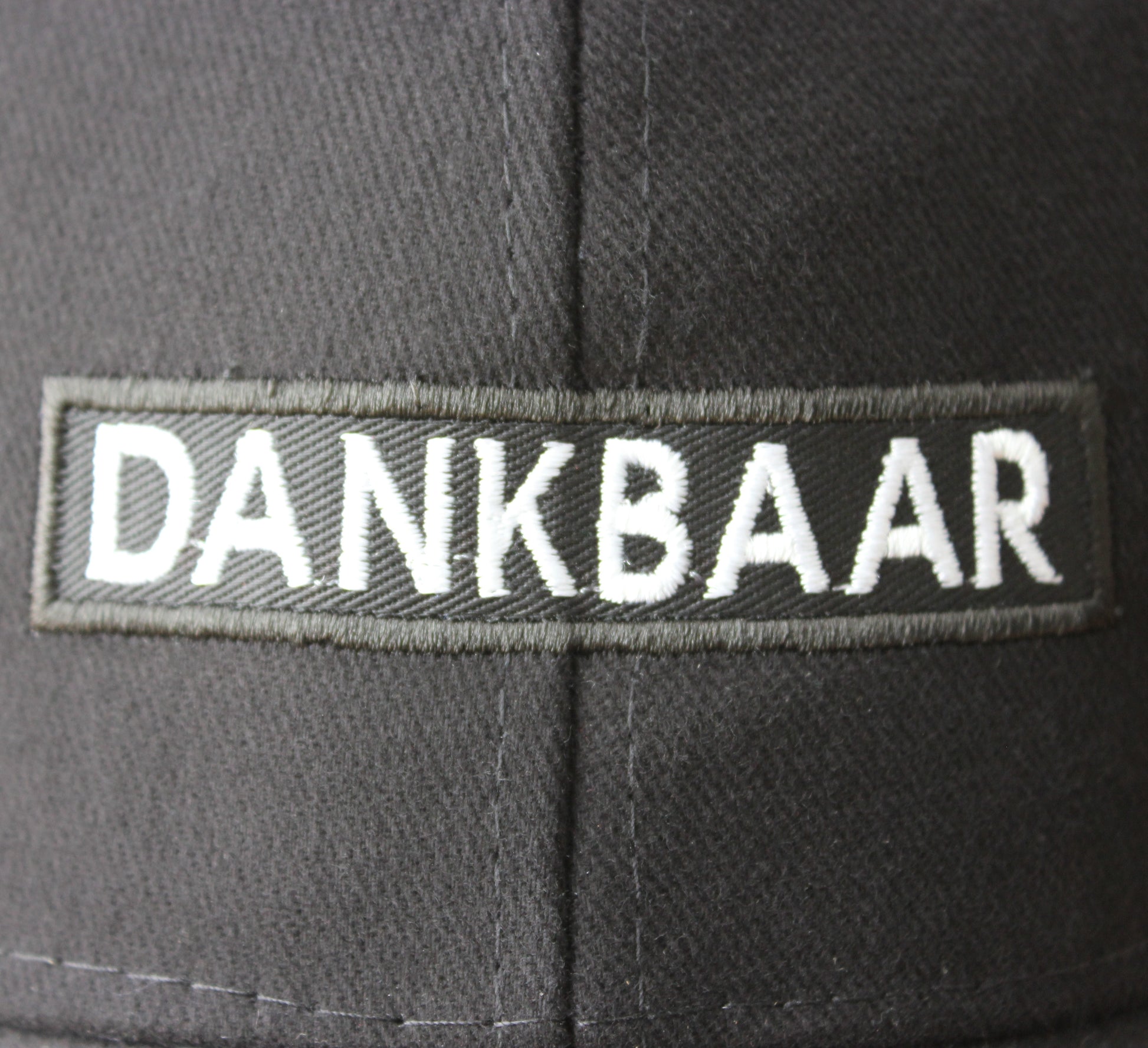 - White embroidery:“DANKBAAR” (front), 1 Tess 5:18 (side)