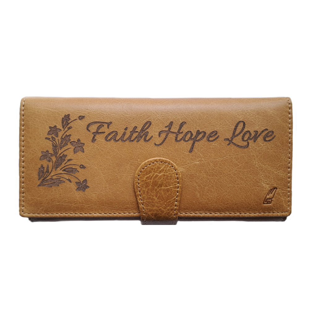 Carry your essentials with purpose and elegance. Crafted from premium tan genuine leather, this timeless wallet is more than just a functional accessory—it's a daily reminder of what truly matters: Faith, Hope, and Love.