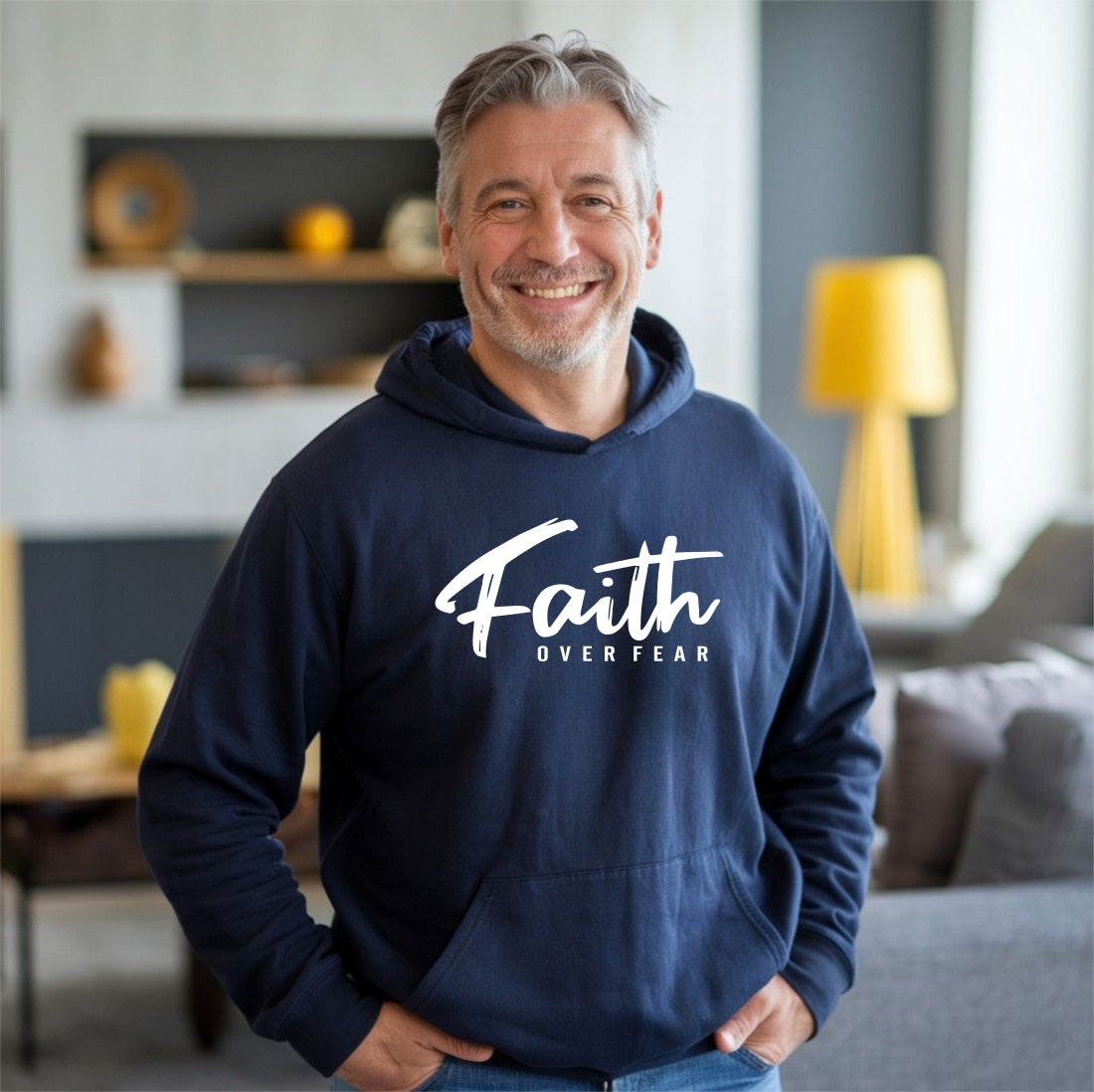 Live your life with Fearless Faith. Be reminded to choose Faith daily with our Faith over Fear Christian Hoodie. Made from a soft, pill-resistant blend of Cotton and Polyester, this Navy blue hoodie features a bold screen-printed message. Perfect for church, casual outings or outdoor adventures.