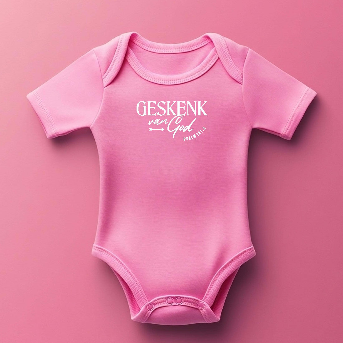This adorable pink onesie is a perfect gift for any baby. The "Geskenk van God" (Gift from God) screen print is a beautiful message that celebrates the preciousness of every child. Made from soft, breathable fabric, this onesie is comfortable and easy to wear.