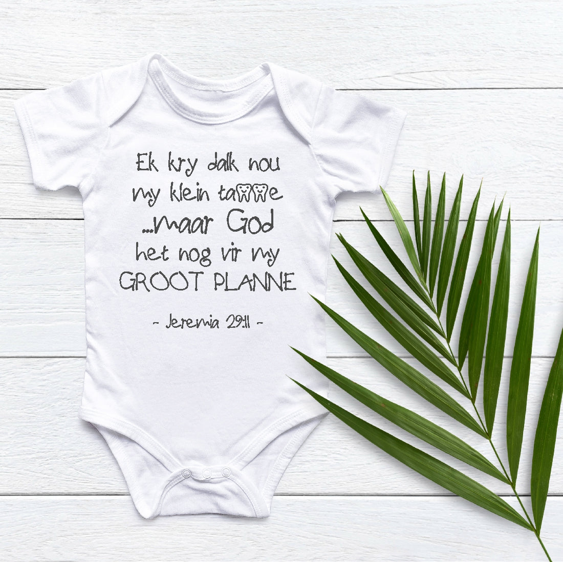Wrap your little one in love and faith with our adorable Groot planne baby onesie. This soft and comfortable Short-sleeve onesie features the heart-warming message "Ek kry dalk nou my klein tanne.....maar God het vir my groot planne" screen-pressed onto the front. It's the perfect way to express your Christian beliefs and shower your baby with blessings.