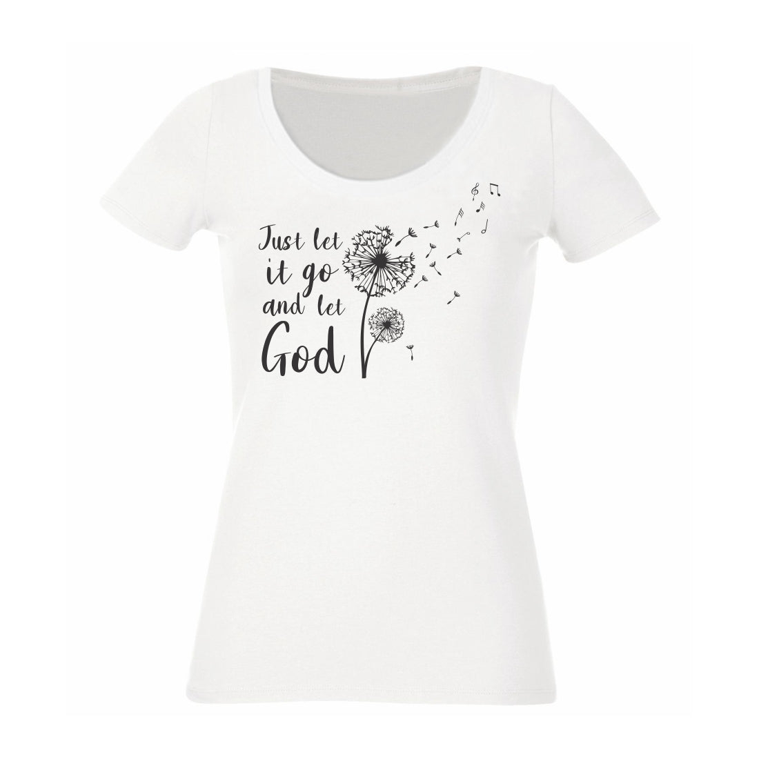 Experience comfort and style with our Christian Ladies T shirt. Made with a fitted design, for stylish wear. Embrace your faith and let go of any worries as you wear this white shirt featuring the phrase "Just let it go and let God".