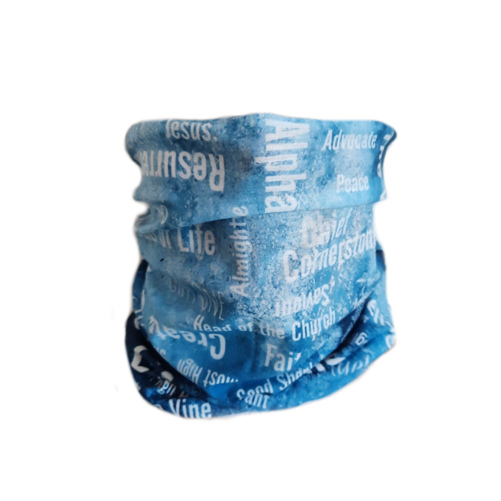 Experience the perfect blend of faith and fashion with our Sky Blue Names of Jesus Neck Gaiter. Order yours today!