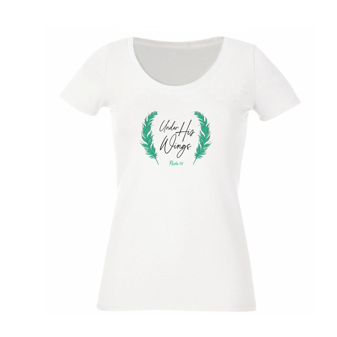 Wrap yourself in comfort and faith with our Under His Wings ladies’ t-shirt. Crafted from soft, breathable cotton in classic white, this versatile tee features a bold, with the words screen-printed Under His Wings — inspired by Psalm 91:4.